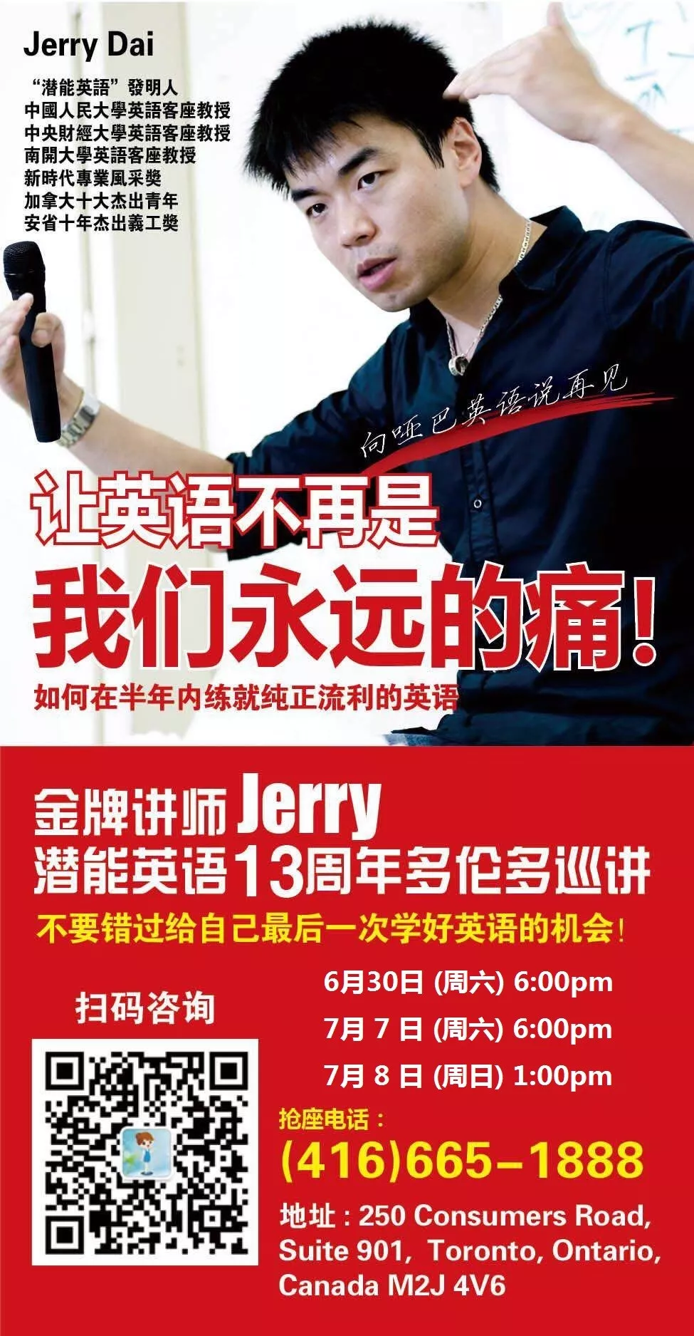 居住在加拿大的你还在纠结不能开口说英语吗?公司面试不能准确表达自己,看到心动的白妹不敢开口聊天,还是不会跟西人同事聊天而导致关系不恰?不用再担心,现在你的福利来了,Jerry潜能英语13周年加拿大巡讲来到加拿大,现在独家开放100个免费讲座的名额,仅此这么一次机会,报满即停!千万不要错过。一起来,让英语不再是我们的痛吧!