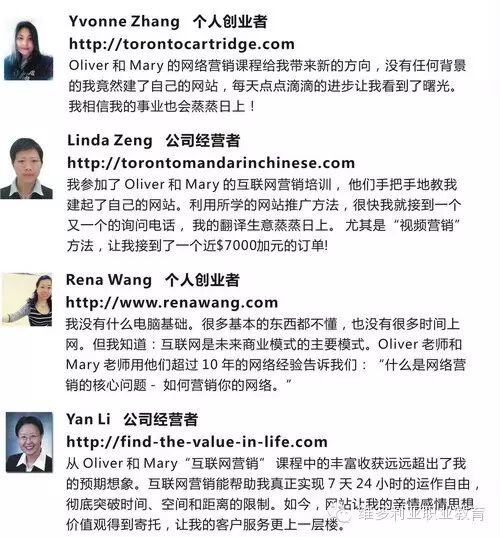 2. 6年互联网营销北美培训及授课经验,6年间,有近2万西人和华人得益于Oliver和Mary的课堂,培养出多位非常优秀的生意人,企业家。每个人经过Oliver培训后,获取很多的“绝活”都将成为自己专业领域的网站营销高手,超越95%的竞争对手。