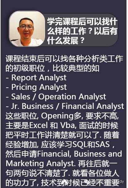 工作经验班里教的知识,是和工作挂钩的。EXCEL中的PIVOT TABLE,MARKETING中的SALESFORCE CRM, GOOGLE ANALYTICS都是.