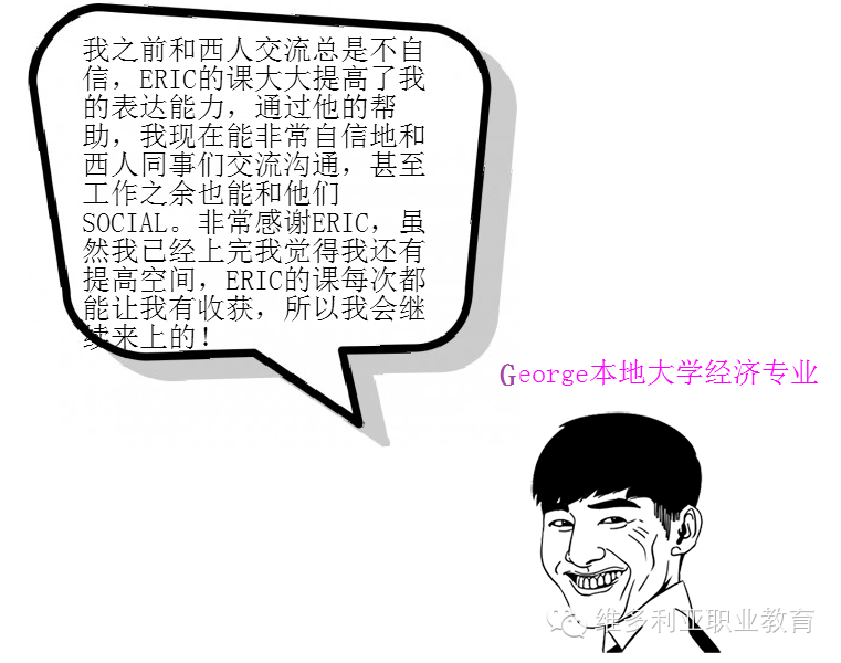 维多利亚最受欢迎的老师—Eric Liu,Scotiabank Senior Director, Toastmaster 演讲大赛两次一等奖得主,被学员亲切称为“平民英语大师”。Eric职场独到之处在于,他在短短三年内从普通的技术人员提升到Director,很多人都对他快速提升感到不解,而他的秘诀就是深知"HOW TO TALK"! Eric老师教给您他独创的与西人同事聊天的技巧,以及在众人面前从容的演讲技巧。