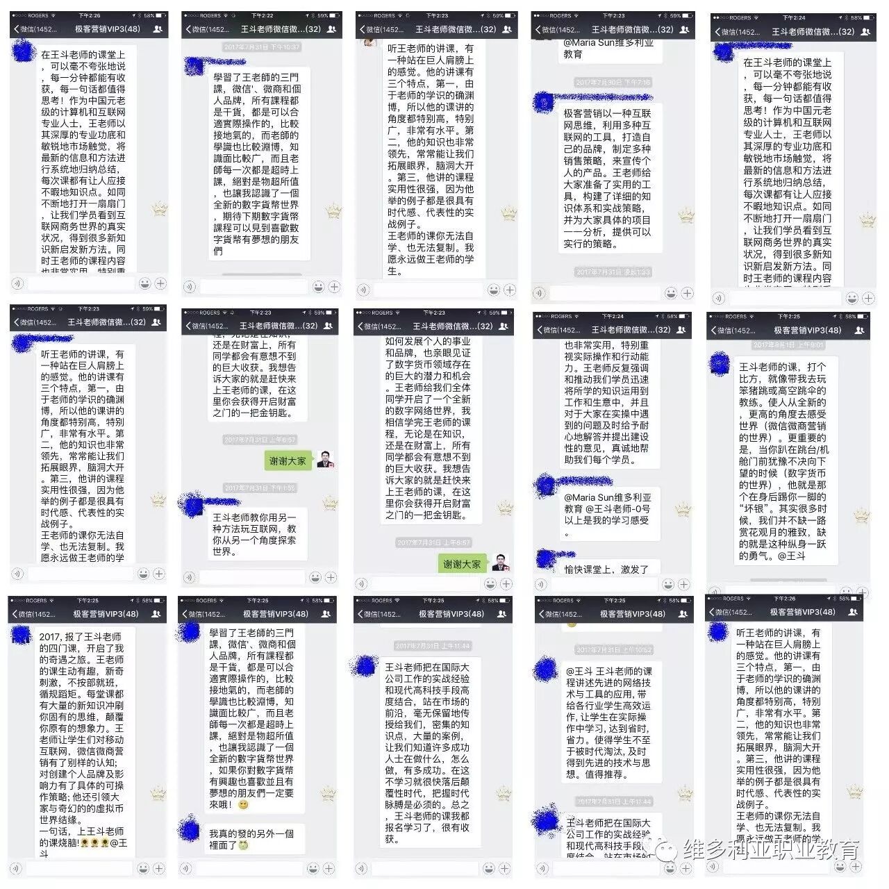 【学员 JULIE】我是2013年开始接触微商和网络营销方面的,但始终不得要领,一是自己知识和精力有限,二是很多技巧和方法都是借鉴别人的,不是很适合当时我的情况。认识王斗老师后,他渊博的知识和充满热情的态度深深感染了我,如今我的平台在王老师的帮助下发展极为顺利,真是我的贵人啊!