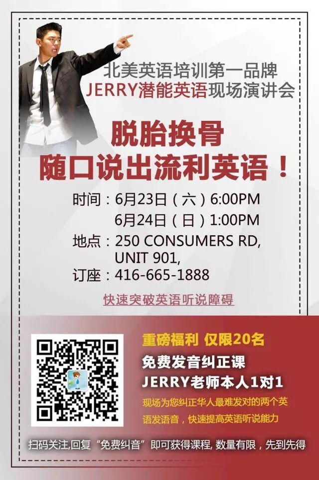 居住在加拿大的你还在纠结不能开口说英语吗?公司面试不能准确表达自己,看到心动的白妹不敢开口聊天,还是不会跟西人同事聊天而导致关系不恰?不用再担心,现在你的福利来了,Jerry潜能英语13周年加拿大巡讲来到加拿大,现在独家开放100个免费讲座的名额,仅此这么一次机会,报满即停!千万不要错过。一起来,让英语不再是我们的痛吧!