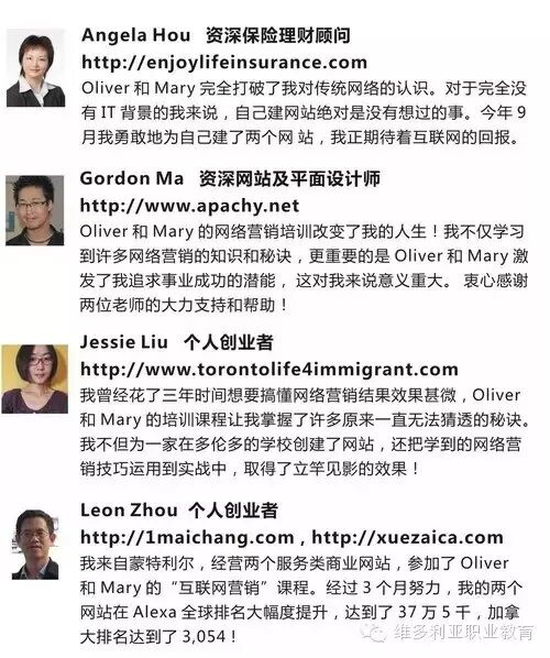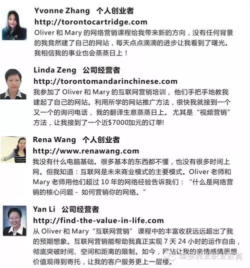 1. 根据在北美互联网营销十多年的实战培训咨询经验,Oliver和Mary老师创建了独到的WELCOME™ 网络营销系统,有效地帮助中小企业和创业者在互联网上拓展市场,实现销售翻倍。