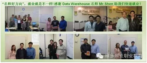 【成功学员】Selina;一直从事Sales工作,完全没有IT基础背景。朋友认为她有Business Concept,所以推荐她到维多利亚来学习Data Warehouse。Selina来试听了沈老师的公开课后,选定了Data Warehouse这个就业方向,并参加了沈老师的Data Warehouse理论和实战相结合的三门课程。学习过程中,她按照老师要求认真学习,同时积极准备求职,Data Warehouse沈老师也毫无保留的为她修改简历和辅导面试,在老师的细心辅导下,最终她成功获得Data Warehouse高薪职位。在试用期间,没有基础的Selina对Handle工作不太有信心,但沈老师仍然一直在帮助她,从而让她顺利通过试用。